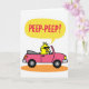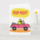 This greeting card shows a small yellow bird character wearing dark sunglasses and driving a bubblegum-pink open-top car, giving off a friendly, flirty confidence like it’s cruising by to say hello 🐇. The bird sits slightly to the right, hands on the wheel, with a jaunty tilt that suggests it’s showing off for someone just out of frame. The car is drawn with chunky, gear-like wheels and thick black outlines, keeping the look simple and graphic. Above the driver, a rounded yellow speech bubble floats near the top and adds a chatty, companionable feel, as if the bird is calling out to a friend. Inside the bubble, the text “PEEP-PEEP!” appears in bright red, set large and centered so it reads like a cheerful honk. The background stays plain white, making the yellow, pink, and red stand out clearly, with the black outlines keeping every shape easy to spot 🌷. The speech bubble sits high above the car while the pink vehicle stretches across the lower half, with the bird’s sunglasses forming two dark ovals that anchor the face.