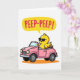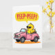This card features a sunny yellow little bird character driving a retro bubblegum-pink convertible across a white background, with a cheeky tongue-out grin that feels like a friendly tease. Black sunglasses sit on its face, adding a flirty, carefree look as if it’s heading toward someone special. Above the car, a lopsided yellow speech bubble floats near the top, holding the text “PEEP-PEEP!” in strong red letters. The bright yellows and soft pinks create a sweet, affectionate contrast, like a lighthearted hello shared between close friends. A small orange shadow beneath the car gives it a grounded, just-rolled-by moment, keeping the scene airy and simple. The text is centered inside the bubble and stands out sharply against the yellow, making it the first thing you notice after the character. A tiny 🌷 or 🐇 doodle could fit naturally beside the bubble without crowding the open space. Chrome details along the car’s edges and the rounded windshield are drawn with smooth highlights against the white backdrop.