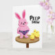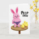 This card features a stylized pink bunny standing on a round, earthy brown wooden table, its tall ears upright and cheeks softly rosy 🐰. The bunny wears purple underwear dotted with small green clover shapes, adding a cheeky contrast to its sweet face. To the right, three tiny yellow chicks huddle close together, their little orange beaks nearly touching as if sharing a friendly secret 🐇. The plain white background keeps the scene simple and lets the characters feel close and connected, like a small group posing for a silly inside joke. Across the top, the phrase “PEEP SHOW” appears in chunky, hand-drawn lettering in dark ink, centered above the characters. The bunny’s forward-facing stance pairs with the chicks’ tight cluster to create a light romance-of-friendship feel, like they’re all in on the same teasing moment. The table is shown as a rounded oval with soft shading underneath the bunny and the chicks.