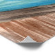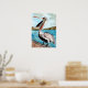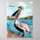 traditional watercolor painting of a pelican bird sitting on a pier begging for some fish as a decorative poster print.