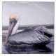 Profile of a pelican - the brown pelican in the original photograph on this large Ceramic Tile is gliding along the water of a canal on Florida's Gulf Coast. The side of a boat in the background shows the shimmering reflections of the blue water. The photo is in shades of blues, soft grays and browns, with a touch of yellow on the pelican's head. The tile is available in two sizes, and optional framing.