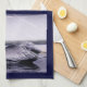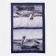Profile of a pelican - the brown pelican in the original photograph on this 100% cotton twill kitchen towel is gliding along the water of a canal on Florida's Gulf Coast. The side of a boat in the background shows the shimmering reflections of the blue water. The photo is in shades of blues, soft grays and browns, with a touch of yellow on the pelican's head. The background behind the photos is dark blue, but can be changed if you prefer.