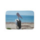 Pictured standing on a beach rock at the sea side is a hungry pelican waiting for tasty fish.