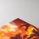 A silhouette of a pelican bird sits on a rock overlooking a sea as palm trees burn fiercely in the distance, casting an intense glow