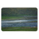 A photograph of a river in Yellowstone National Park, with several groups of Canada Geese along it's shoreline and a few American Pelicans resting in the middle of the river on some exposed .