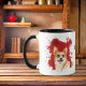 A beautiful water color portrait of a Pembroke stands out against a bright red abstract paint splatter background. The image is on two sides of the mug, with your name or other custom text in black between them.