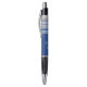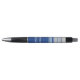 Stripes in horizontal bands in single crochet, around barrel of pen. White with thin blue (2 shades) and gray lines on top, broad band of dark blue at bottom. Personalize name in white on bottom band.