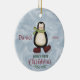 This precious ornament has a whimsical penguin on ice skates wearing a green scarf. The background is a blue and white swirling design that mimics a snowstorm. The bottom says Baby's First Christmas and there's a place for you to personalize it with your baby's name and the year. The opposite side has the same background and says "Baby it's cold outside".
