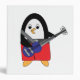 An adorable penguin in red shorts jams out on an electric bass guitar on a binder.