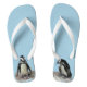 These flip flops feature adorable African Penguins standing on a rocky ledge against a blue background. Penguins are aquatic, flightless birds whose wings have become flippers. Each has a black stripe and black spots on the chest. The pattern of spots is unique for every bird, just like human fingerprints. They have pink glands above their eyes and pink and black feet.