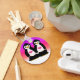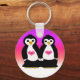 A cute penguin couple holding hands. Pink hearts on their tummies. A shaded background of pink and purple.