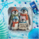 A charming penguin family stands together, each adorned with colorful knit hats and scarves and holding a fun sign.