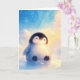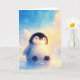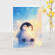 A fluffy baby penguin sits happily in a snowy landscape, bathed in the warm glow of a golden sunrise. Its tiny black flippers rest gently on the soft snow, and its round eyes gaze upward with a peaceful and content expression. Snowflakes drift through the crisp arctic air, creating a dreamy winter wonderland. The backdrop features soft, glowing clouds blending seamlessly with a radiant blue sky, giving the entire scene a magical, serene ambiance. This adorable penguin illustration captures a heartwarming moment, perfect for anyone who loves winter, nature, and cute animal designs.