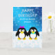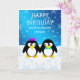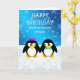 Two cute black and white penguins holding hands on a winter snowy day. On the front and inside of the card are templates you can use to personalize this cute birthday card.