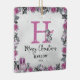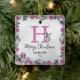 Cute kids monogram pink christmas ornament featuring a washed out gray background, elegant watercolor xmas florals & foliage, adorable baby penguins, snowman, gifts, the childs initial, name, year, and the festive greeting 'merry christmas'.