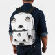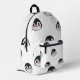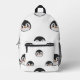 Backpack with a very cute penguin design, white with a pattern of penguin faces. The penguins are in classic colors of white, black, and orange, with happy expressions. Front zippered pocket and black top handle for easy carrying. On the side of the backpack, there is a mesh pocket for holding water bottles. Perfect backpack for school or hiking, thanks to its cheerful and functional design!
