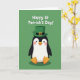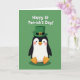This greeting card shows a round cartoon penguin centered on a smooth, solid green background, dressed up for St. Patrick’s Day with a deep emerald top hat. The hat has a dark band and a small golden buckle, with a little shamrock tucked into the brim for a sweet ☘️ touch. The penguin’s black-and-white body is softened by rosy pink cheeks, and its bright orange beak and webbed feet add a warm contrast that makes it feel friendly and approachable 💚. Its gentle, slightly bashful expression and relaxed stance suggest the kind of easy closeness you’d share with a good friend or someone you adore. Near the top of the design, the text “Happy St Patrick’s Day!” sits above the penguin in rounded white lettering that stands out clearly against the green. A faint shadow beneath the penguin anchors it to the ground and adds a bit of depth. The overall scene stays simple and focused, with the penguin’s hat, shamrock, and bright accents drawing the eye against the even green field.