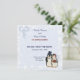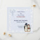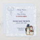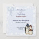 Sweet romantic Penguin bride and groom in their wedding attire with light blue damask background. These Save the Date cards are ready for you to customize with your wedding information.