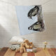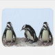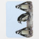 This baby blanket features adorable African Penguins standing on a rocky ledge against a pale blue background. They are aquatic, flightless birds whose wings have become flippers. Each has a black stripe and black spots on the chest. The pattern of spots is unique for every penguin, just like human fingerprints. They have pink glands above their eyes and pink and black feet.
