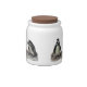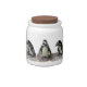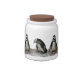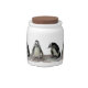 This white porcelain candy jar features adorable African Penguins standing on a rocky ledge. They are aquatic, flightless birds whose wings have become flippers. Each has a black stripe and black spots on the chest. The pattern of spots is unique for every penguin, just like human fingerprints. They have pink glands above their eyes and pink and black feet.
