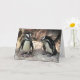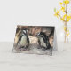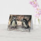This note card features two adorable African Penguins standing on a rocky ledge. They are aquatic, flightless birds whose wings have become flippers. Each has a black stripe and black spots on the chest. The pattern of spots is unique for every penguin, just like human fingerprints. They have pink glands above their eyes and pink and black feet.