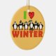 A group of penguins dressed in winter hats and scarves and text that reads "I Love Winter" on keepsake holiday ornaments perfect for penguin lovers!