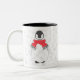 A fat penguin and a tall penguin show off their red winter accessories in the snow