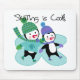 Two penguins ice skate on the frozen pond dressed in striped, colorful winter hats, scarves, and mittens and black text reads Skating is Cool on skating theme T-shirts, mugs, cards, bags, keepsakes, pillows, hoodies, stickers, and much more!