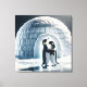 Two penguins slow dancing together on a glistening icy surface in front of a large igloo