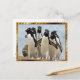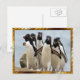 Six Penguins Walking along the ocean on the sandy beach. With a big rock and the nice baby blue sky. This postcard has a gold bronze and silver frame.
