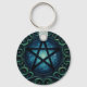 This whimsical keychain features a black pentacle surrounded by greenish blue cosmic skies finished as an oil paint print.