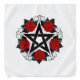 Black pentagram with pattern, decorated with blooming, red roses with leaves on white background. Tattoo style.