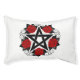 Black pentagram with pattern, decorated with blooming, red roses with leaves on white background. Tattoo style.
