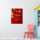 This colorful Chinese wedding reception board features peony flowers and gold double happiness symbol on a shimmering ruby red background. With a wedding welcome text in an elegant handwritten script.