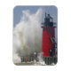 People on jetty watch large breaking waves in magnet