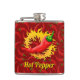 Red chili pepper with circle of flame on removable seamless pattern background. Custom text.