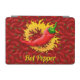 Red chili pepper with circle of flame on removable seamless pattern background. Custom text.