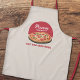 An apron when you work at a pizzeria restaurant, food truck, home delivery food service or as a cooking chef. It consists of a pizza with pepperoni, olives and basil placed on a wooden board and a red semicircle.