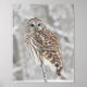 An owl perched in a snow storm. Though it may be snowing, this boldly colored owl is visible in falling snow. He sits ready to take flight at a moments notice; watching the distance for his next prey.