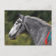 A photo portrait of a dapple grey Percheron draught horse mare, with a red, yellow and turquoise braided mane, photographed at a show in France.