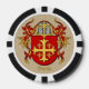 Spanish surname Perez historical arms set on a mottled parchment style background. The reverse of the chip has the symbols for the four suits of cards; a black spade, a red heart, a red diamond, and a black club on the same parchment style background.