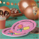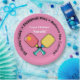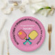 Birthday Cake + Pickleball Play = Balance the Calories! + NAME Cool pink Paper Plates with crossed pickleball paddles and yellow pickleball. Custom text and background color