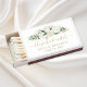Elegant custom matchbox wedding favors feature a watercolor painted floral arrangement with modern and minimal "The Perfect Match" calligraphy script text with flourishes design. Includes a custom monogram of the married couple's name and wedding date in simple stylish text that can be personalized. Colors include neutral cream, ivory, gold, and green with greenery on a clean white background.