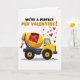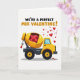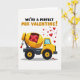 This Valentine's Day card shows a yellow cement mixer truck facing to the right on a plain white background. The truck has dark wheels and a simple, toy-like look that makes it feel friendly and fun. Instead of cement, the mixer drum is filled with shiny red hearts that spill out and float up through the space. The hearts look full and glossy, like little balloons of love, spreading romance across the whole card ❤️💌. At the top, the message reads “WE’RE A PERFECT MIX VALENTINE!” in hand-drawn, block-style letters. The text uses black and warm orange tones and sits clearly above the truck, tying in with the truck’s colors. Overall, it feels like a sweet joke about being a great match, with a little extra chocolate-box charm 🍫.