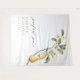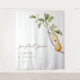 A fabric tapestry backdrop for the theme "perfect pear" featuring watercolor pears, blossom, leaves and branches. "perfect pair" is in green modern calligraphy font. Personalize with names and shower date.