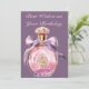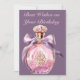 Beautiful card with pink perfume bottle with jewel encrusted lid and jewels in center of bottle. Bow in purple hues beneath lid. Glamor and Luxury in a card. Able to edit and personalize card with own message.
