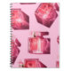 Perfume bottles, pink background, flatlay notebook