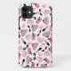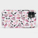 An iPhone 5 case featuring a design consisting of pink and black retro cat eye sunglasses, pink change purses with gray polka dots, pink clutch purses with black bow, pink lipsticks, pink gemstones, and bottle of perfume with pink atomizer.