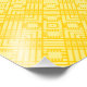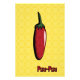 A red peri-peri chili pepper, also known as piri-piri or pili-pili, is decorated with patterns inspired by the traditional sarong capulana from Mozambique and sits on a yellow background with a smaller version of the same pattern and a script label in the corner. This spicy, red pepper was originally cultivated in Mozambique after pepper plants were brought by Portuguese explorers.