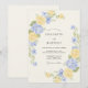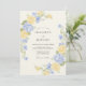 This delicate design features a soft cream backdrop adorned with an airy watercolor floral arrangement. Bright yellow roses mingle with clusters of periwinkle blue hydrangeas and soft green foliage to create a romantic atmosphere. Perfect for a seasonal outdoor ceremony, the palette evokes a fresh and elegant mood.